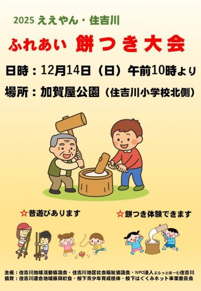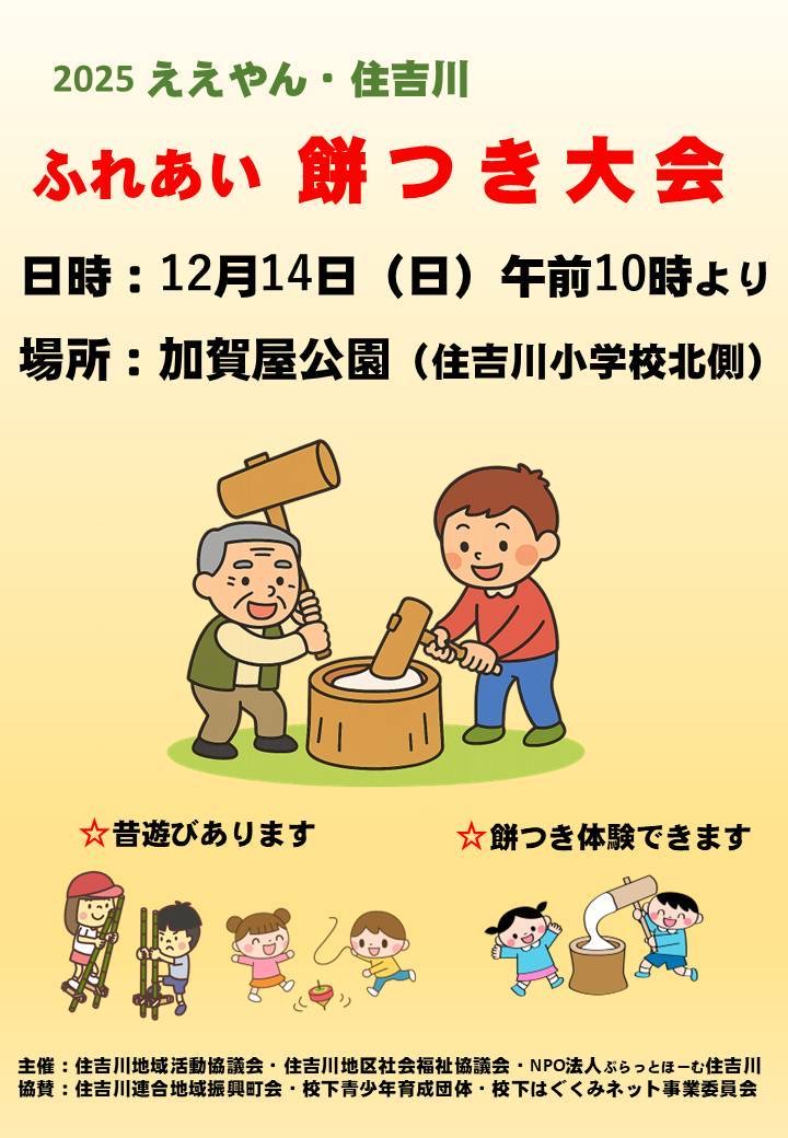 住吉川地域では、地域交流の一環として「ふれあい餅つき大会」を開催します。