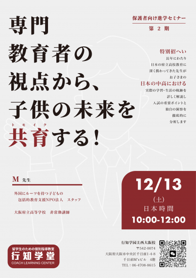 今回のセミナーでは、長年にわたり日本の教育現場で活躍されてきた専門家である M 先生 を講師にお迎えし、「専門教育者の視点から、子供の未来を共創する!」 をテーマに、お子様の学習や生活の具体的な軌跡、そして進学の重要ポイントを徹底的に解説していただきます。
