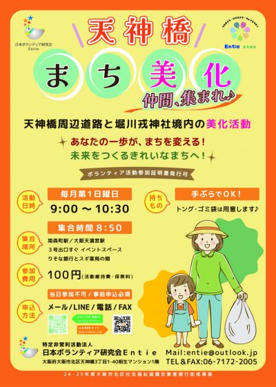 毎月1回集まって、大阪市北区国道沿い、天神橋筋道路、堀川戎神社境内・阪神高速道路高架下の清掃をしています。一緒に活動していただける方を、募集しています。