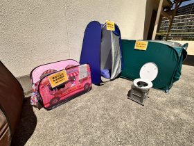 向かって左側には、仮設トイレとテント、授乳用のテント、パーテーションなどが置いてありました。