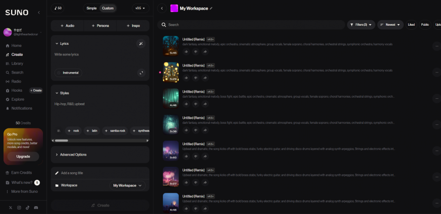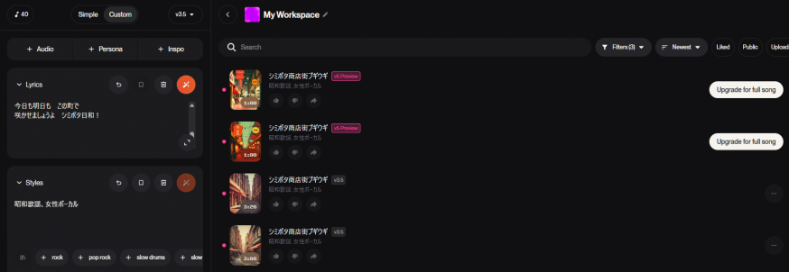 上2つは新しいモデルで生成されたものでフルサイズの曲を使うには有料版にする必要があります。
