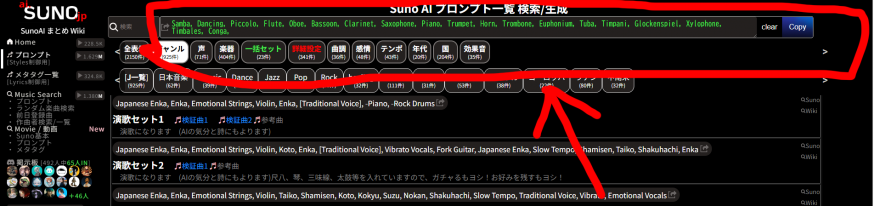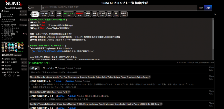 このサイトは『SUNO AI』で使うプロンプトを一覧にしてくれているサイトで、「ジャンル」「声」「楽器」など各タグでまとめられていて、入れたい要素をクリックするだけでプロンプトを作成することができます。
