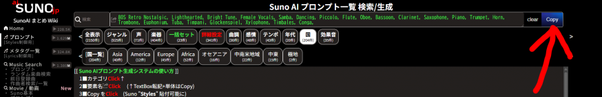 入れたいものを全部入れたら上の欄の右側にある「Copy」をクリックして、『SUNO AI』に戻り、「Styles」にペーストします。