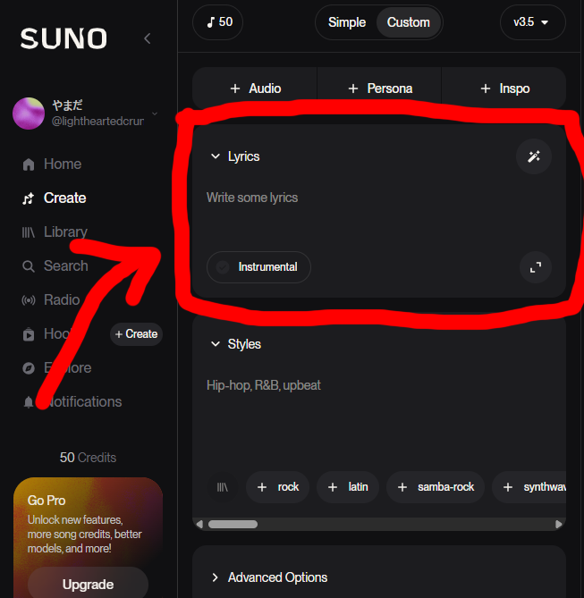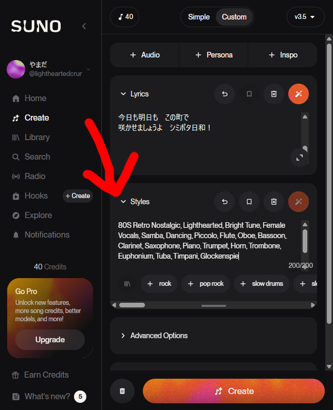 画面左にある「Lyrics」にChat GPTで作った歌詞をコピーペーストします。