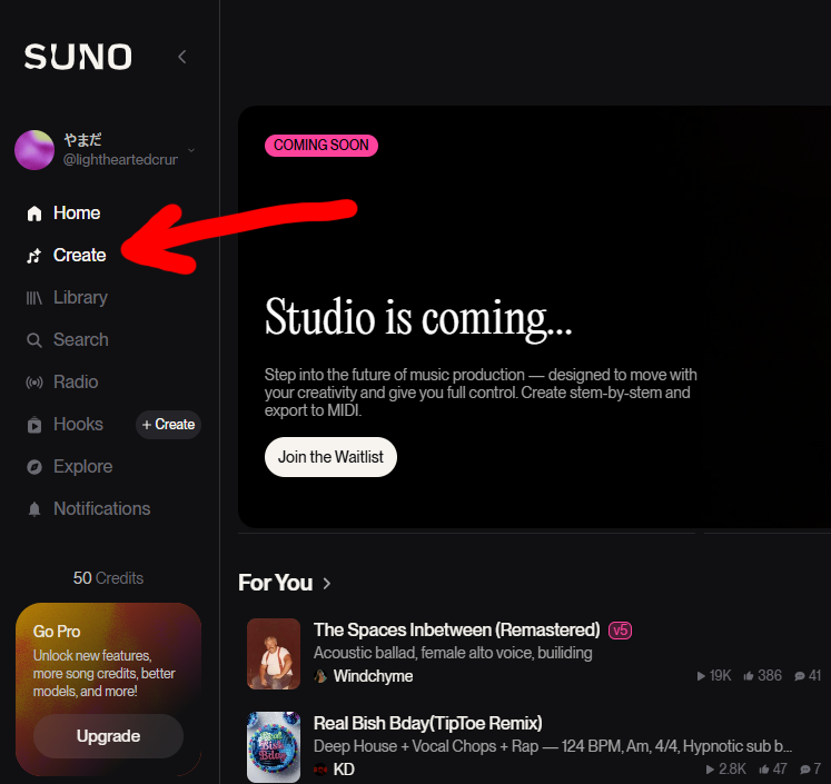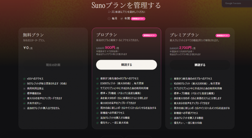 ここで使用上の注意事項として、無料プランだと「商用利用は禁止」になっているので生成した曲の販売はもちろんのこと、Youtube等での使用や公式として使う場合はプロプラン以上に加入する必要があります。