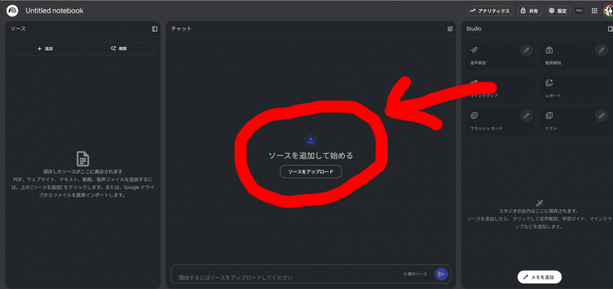 『NotebookLM』は基本的に自分がアップロードしたファイルや特定のウェブサイトなど、こちらで参照するソースを指定して、その内容について機能する『AI』なので、まずはソースを指定してあげる必要があります。